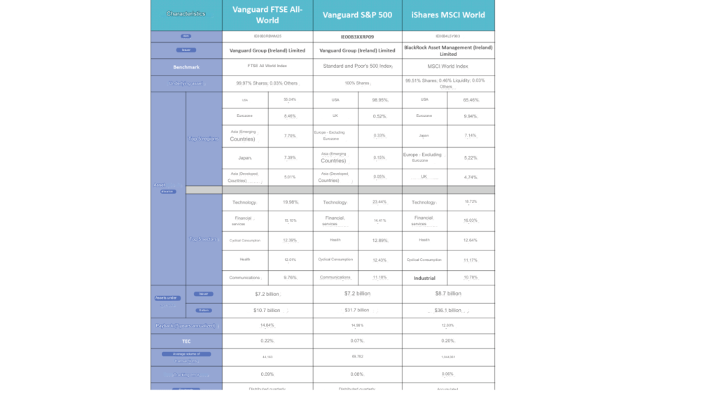 According to Degiro, these are the 3 most traded ETFs on its platform, available for purchase by European citizens: Vanguard FTSE All-World ($VWRL), Vanguard S&P 500 ($VOO), iShares MSCI World ($IWDA). In the table below, we analyse the characteristics of each of them.